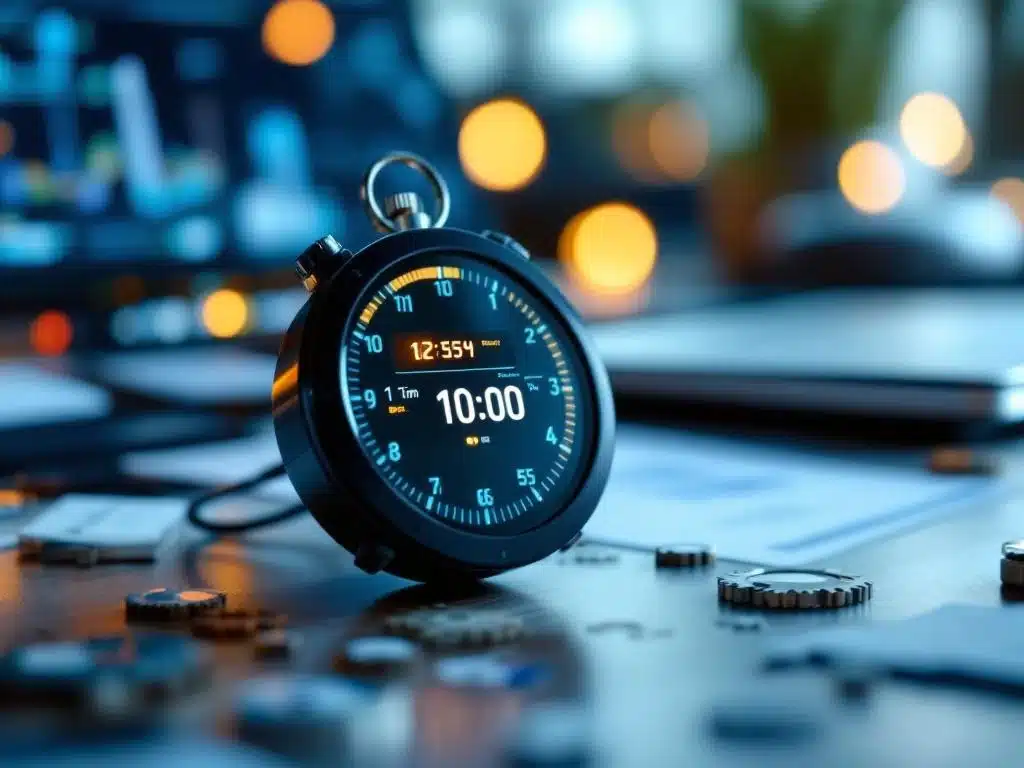 Digitale stopwatch op bureau naast laptop met tijdregistratie-interface, omringd door kalender en werkstroom elementen