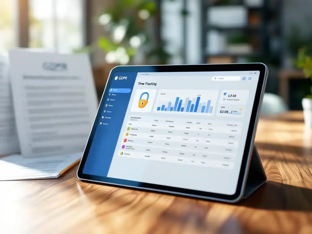 Digitale tablet met tijdregistratie-interface en privacy-iconen op houten bureau, GDPR-documenten op achtergrond